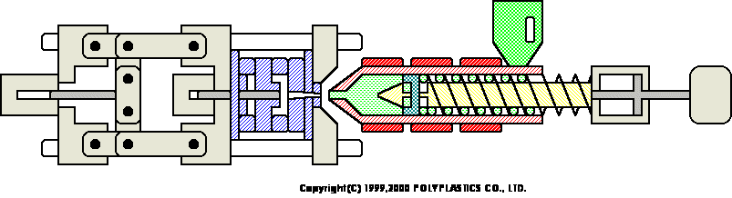 合模裝置是開閉模具以執(zhí)行脫模作業(yè),而且也有如圖所示的肘桿方式,以及利用油壓缸直接開閉模具的直壓方式。注射裝置是將樹脂予以加熱融化後再射入模具內此時,要旋轉螺桿,并如圖所示讓投入到料斗的樹脂停留在螺桿前端,經過相當于所需樹脂量的行程儲藏後再進行射出。當樹脂在模具內流動時,則控制螺桿的移動速度并在填充樹脂後用壓力(保壓力)進行控制。當達到一定的螺桿位置或一定射出壓力時則從速度控制切換成壓力控制。